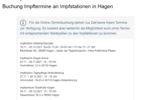 Hagen impft Um das Impfgeschehen zu beschleunigen und jedem Bürger eine Impfung zu ermöglichen, bietet die Stadt Hagen folgende Impfaktionen in den verschiedenen Stadtteilen an. Durchgeführt werden Erst- und Zweitimpfungen und Auffrischungsimpfungen für geimpfte Personen …
