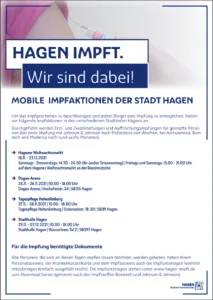 Um das Impfgeschehen zu beschleunigen und jedem Bürger eine Impfung zu ermöglichen, bietet die Stadt Hagen folgende Impfaktionen in den verschiedenen Stadtteilen an.